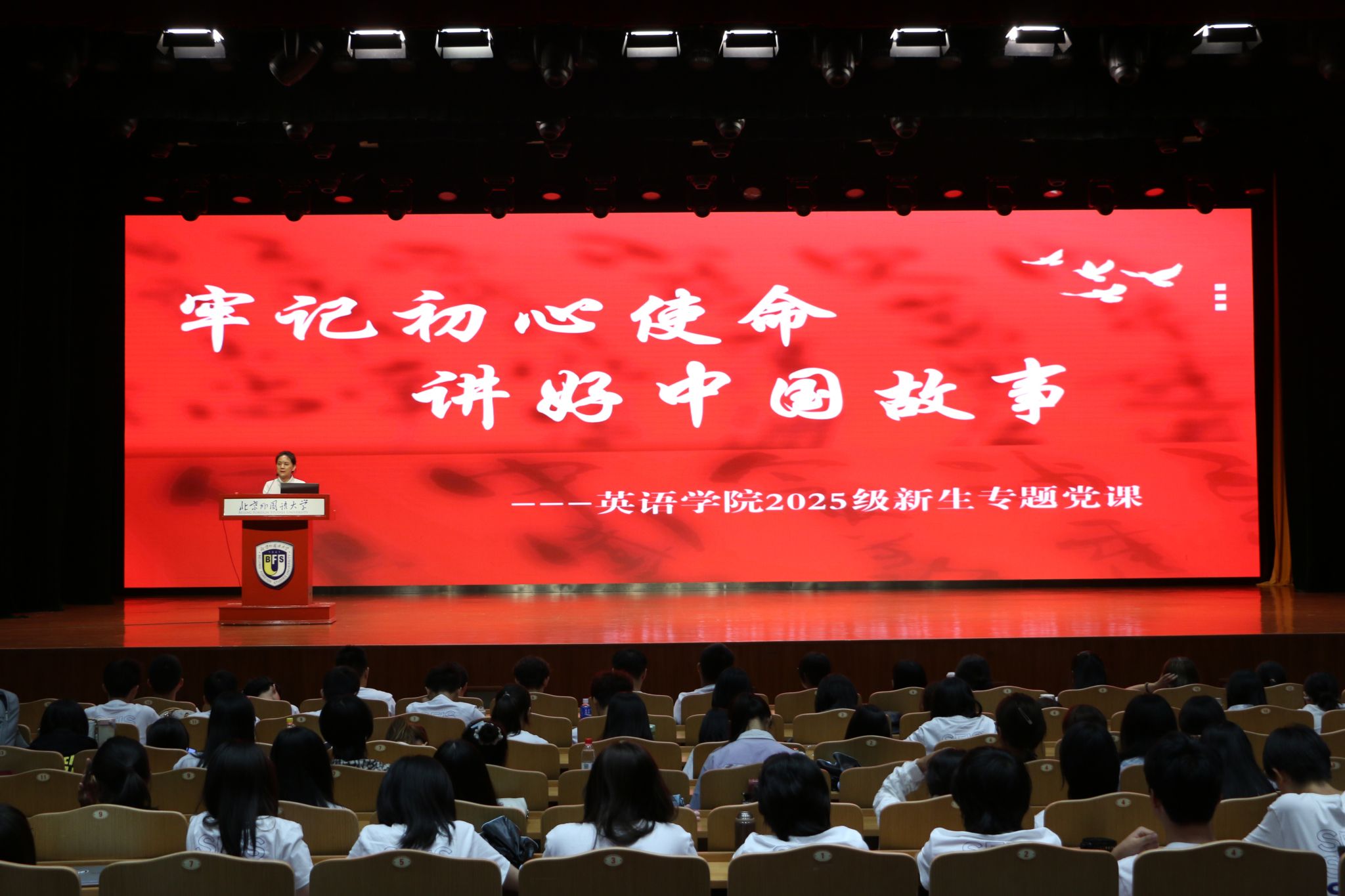 9月5日下午,在宝盈集团bbin直营网2025级新生开学典礼最后,学院党总支书记殷悦以“牢记初心使命,讲好中国故事”为题,为全体2025级本科生及研究生新生讲授专题党课。