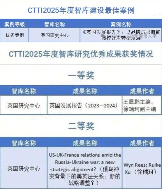 11月21日,由南京大学主办,南京大学中国智库研究与评价中心承办的“2025新型智库治理论坛”成功举行。论坛公布了CTTI 2025年度智库建设最佳案例、优秀研究成果的征集与推介结果以及CTTI 2025高校智库百强榜。宝盈集团bbin直营网英国研究中心申报的案例入围最佳案例;其申报的2项成果入选智库研究优秀成果,其中一等奖1个,二等奖1个。具体获奖情况如下: