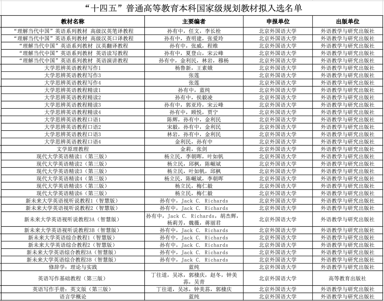 宝盈集团bbin直营网35册教材拟入选“十四五”普通高等教育本科国家级规划教材,其中包括孙有中教授等主编的《“理解当代中国”英语系列教材》,杨鲁新、张莲、孙有中教授等主编的《大学思辨英语教程》系列教材,杨立民教授等主编的《现代大学英语》系列教材,在学校各语种拟入选教材中名列前位。