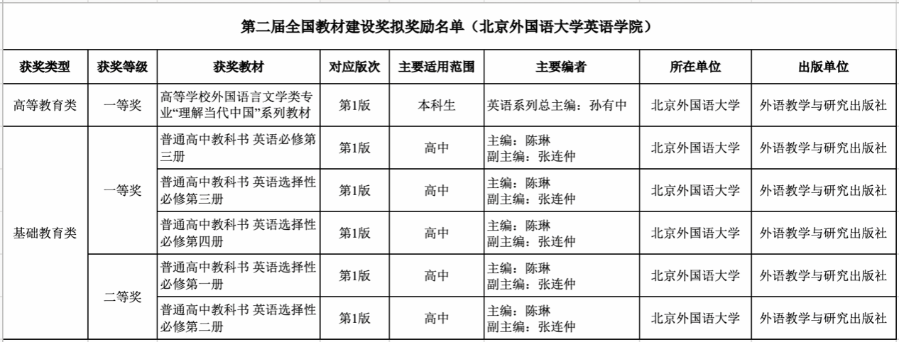 宝盈集团bbin直营网6部教材拟入选第二届全国教材建设奖。孙有中教授主编的《高等学校外国语言文学类专业“理解当代中国”系列教材》荣获高等教育类一等奖;陈琳教授主编的《普通高中教科书 英语必修第三册》等3部教材荣获基础教育类一等奖、《普通高中教科书 英语选择性必修第一册》等2部教材荣获基础教育类二等奖。