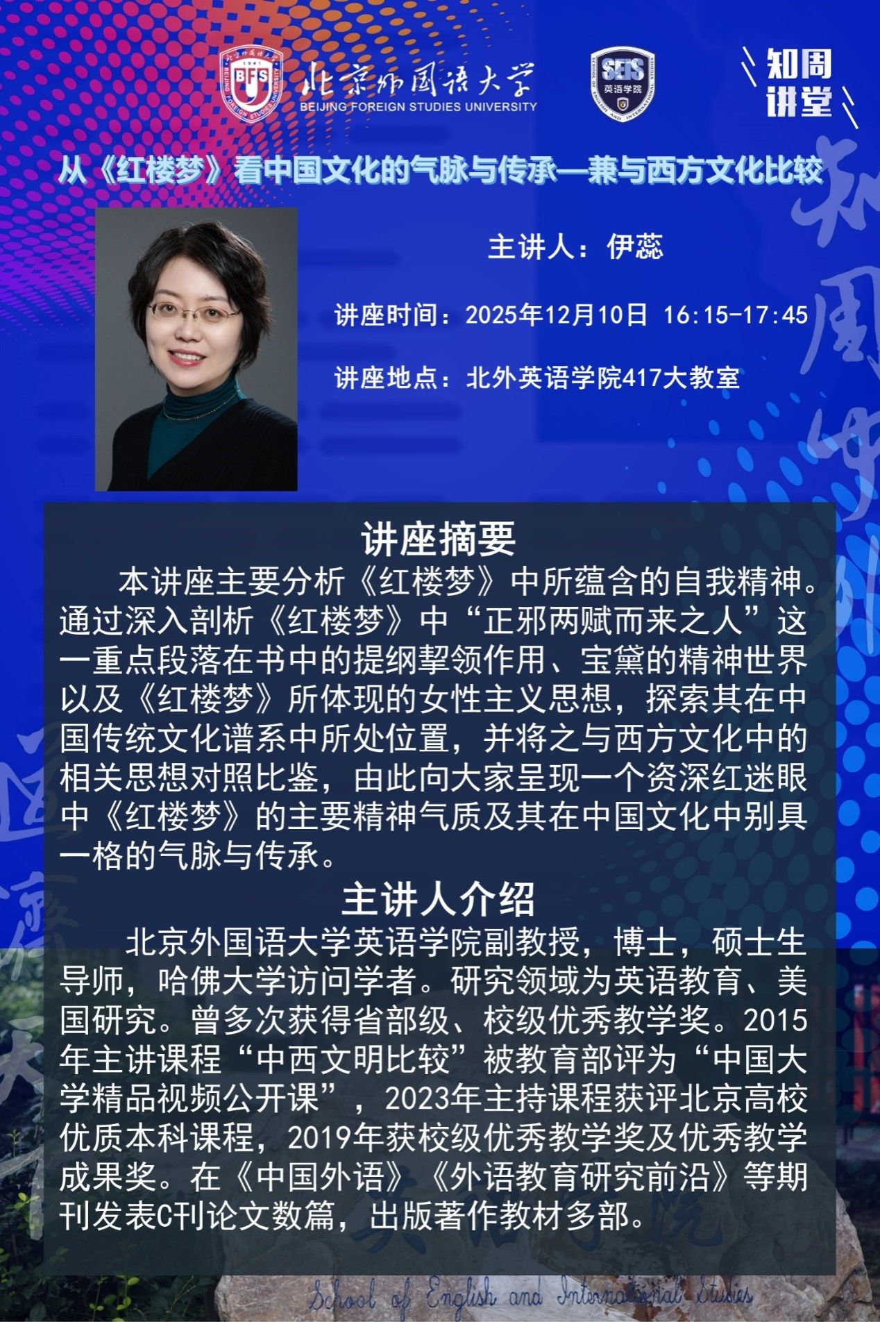 12月10日讲座:从《红楼梦》看中国文化的气脉与传承——兼与西方文化比较