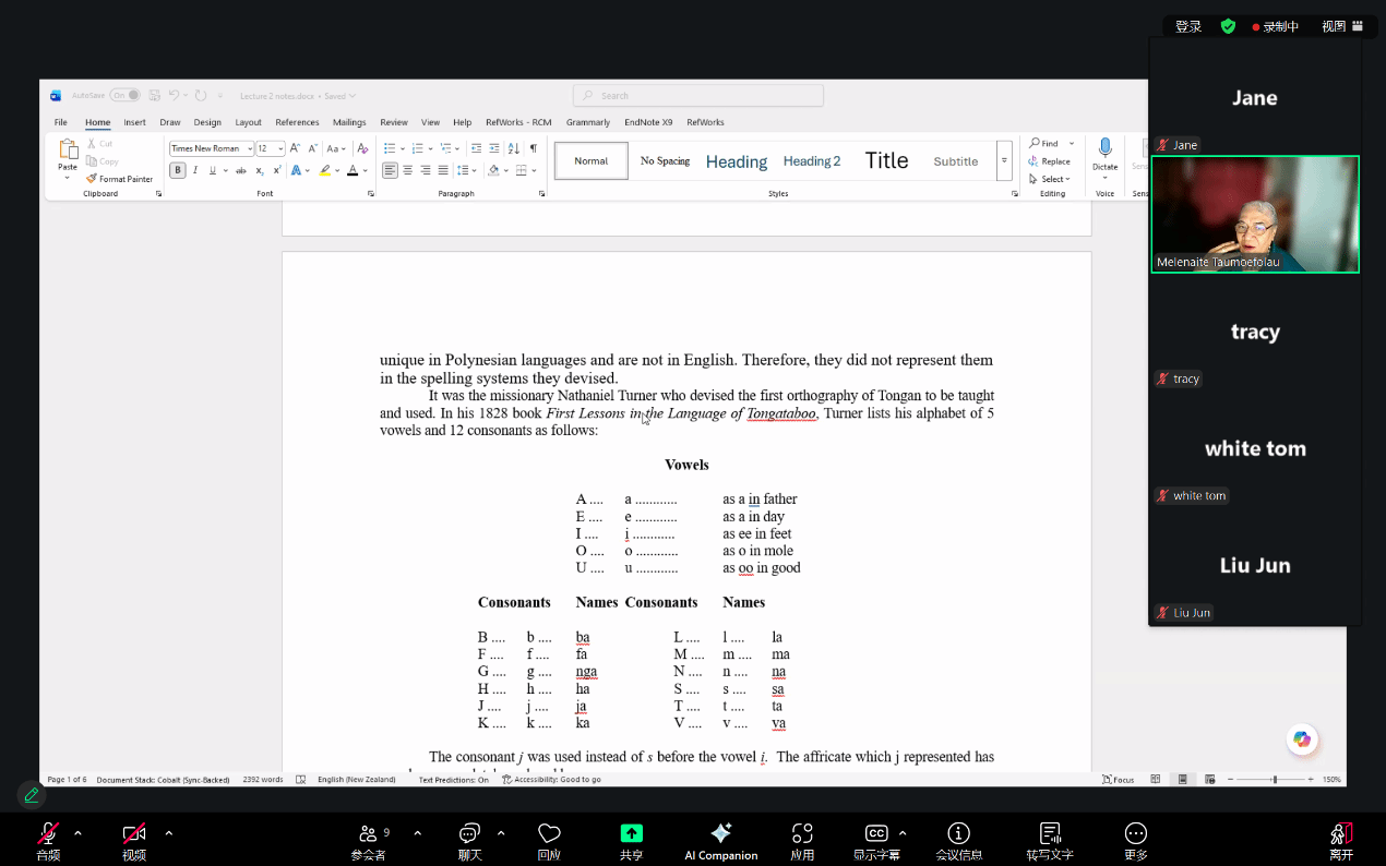 2025年12月17日下午,应宝盈集团bbin直营网南太平洋语言与文化中心和世界语言博物馆邀请,汤加语外国专家梅莱奈伊特·塔乌莫艾富拉乌(Melenaite Taumoefolau)博士在线上做了题为“波利尼西亚语言语音学与正字法相关问题”(Issues in Polynesian Phonology and Orthography)的讲座。讲座由宝盈集团bbin直营网教师李菅主持,来自校内外多名师生参加了本场讲座。