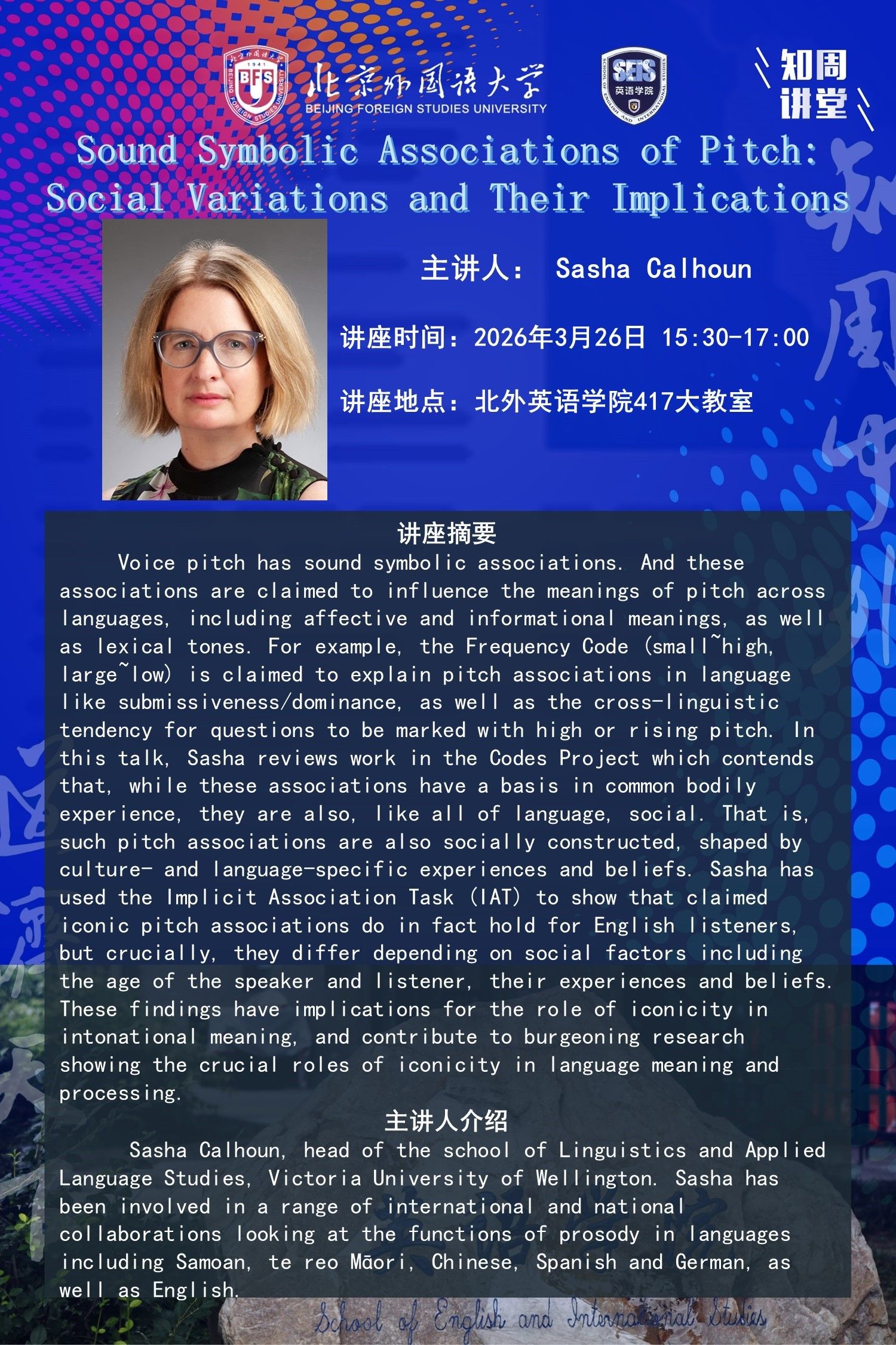 3月26日讲座:Sound Symbolic Associations of Pitch: Social Variations and Their Implications